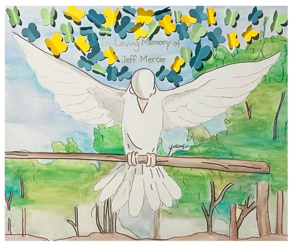 As a tribute to Mercer, Yukina Liu ’30 made a painting of a white dove to symbolize peace: “I hope [Mr. Mercer] is not in pain anymore from the disease, and I hope [my painting] can stay in the school for a while.”